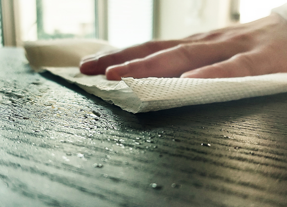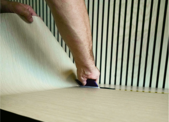 Stacca lentamente la carta di supporto dal lato adesivo della pellicola. Appoggia la pellicola sulla superficie preparata e allineala con cura affinché le venature o il motivo seguano le linee del mobile.